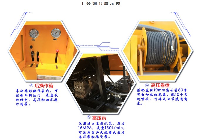 罐體采用國標優質碳鋼4mm制作,罐體有效容積為8-10立方。配備進口高壓泵(高壓泵壓 力:16Mpa 、流量:130L/min ),夾心取力器,卷簾門,齒輪泵,高壓三通,液壓閥,帶亮管,帶液壓卷盤,帶φ19MM專用高壓清洗管60米,帶10個高壓噴頭,帶消防接頭,帶警示燈。