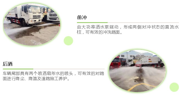 由大功率灑水泵驅動,形成兩側對沖狀態的直流水柱,可有效的沖洗路面。