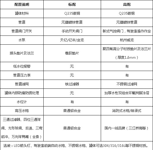 整車帶一個專用40/50大功率灑水泵(垂直最大吸程6米),多功能灑水車配備2個前沖(噴)(能將路面泥巴、塵土、垃圾沖干凈);前沖可沖洗約7-8車道,高炮射程26米,2個后灑(能均勻地將水灑在路面,一次灑水寬度14米)、2個側噴(花灑)(能均勻地將路旁綠化帶澆灌)、帶1個后工作平臺,平臺上安裝1個綠化灑水高炮(灑水炮可全方位旋轉,可連續調成直沖狀、大雨、小雨、毛毛雨,霧狀可調節沖洗高大樹木),引水時間小于4min,流量40m3/h。帶1個消防接頭,帶1個自流閥,1個過濾裝置、人性化爬梯及側防護欄,安裝灑水音樂喇叭,配專用水泵(泵進泵出)及消防栓接口,兩根等長輸水管,金屬漆,其余標配。用戶可選裝消防大功率消防水泵、應急時可做消防灑水車使用。