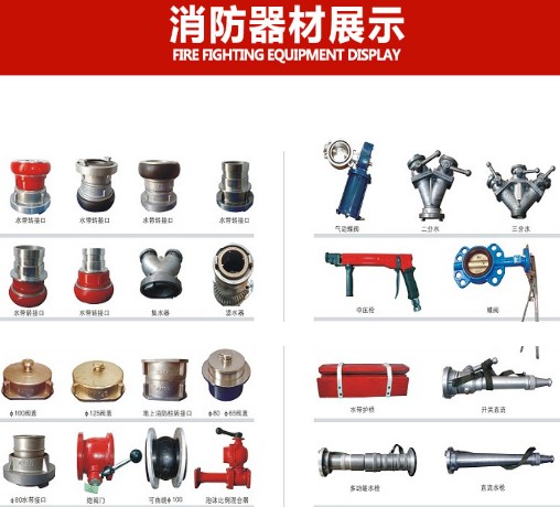 消防器材標準配置:消防吸水管、濾水器、分水器、消防水帶、水帶掛鉤、水帶包布、異徑接口、同型接口、直流水槍、消防栓過渡接頭、開花水槍、直流開關水槍、空氣泡沫槍(泡沫消防車專用)、羊鎬、地面扳手、吸水管扳手、護帶橋、混合器吸液管、腰斧、消防板斧、鐵鍬、撬扛。