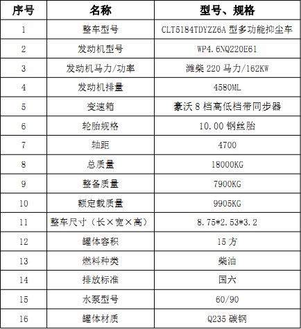 1、整車型號: CLT5184TDYZZ6A型多功能抑塵車
